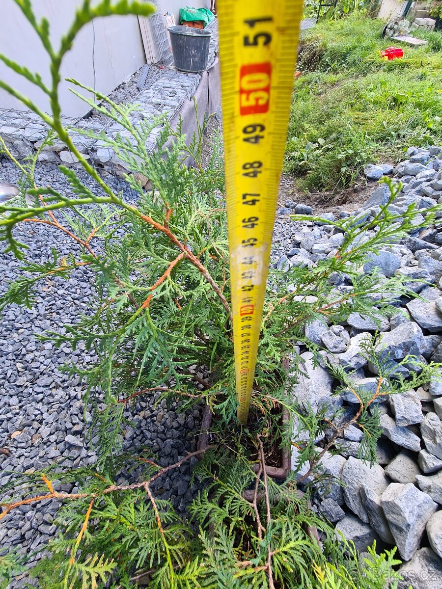 Sazenice thuje Zerav západní, 20,-/ks celkem 33 kusů v truhlíku dohromady a 11 kusů zvlášť v kelímku. Výška 30-50 cm. Pokud si je někdo vezme všechny najednou, cena 700,-