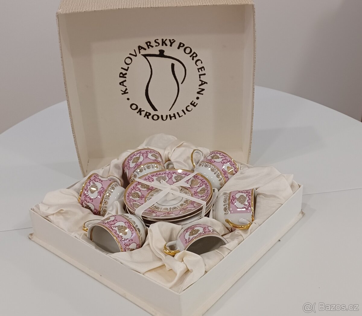 Prodám nepoužívanou nerozbalenou porcelánovou sadu - karlovarský porcelán Okrouhlice Jedná se o kávový servis - 6 hrníčků a 6 talířků, jemný design, laděné do růžova, pozlaceno. Původní krabice, puvodnu balení, nic není poškozeno, nebylo nikdy používáno.