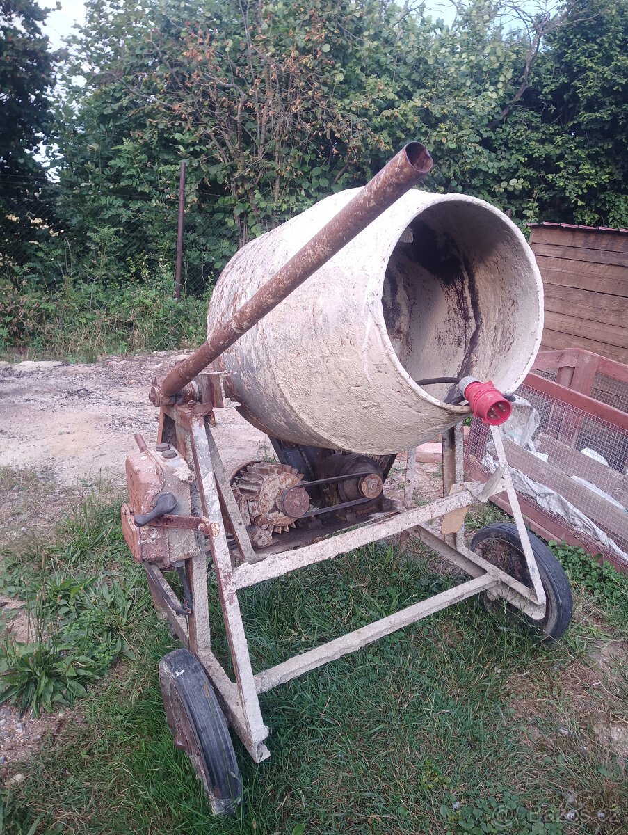 Prodám plně funkční stavební míchačku domácí výroby - silné plechy a pevná konstrukce, pohon z motoru na převodovku je klínovým řemenem, z převodovky na buben je řetězem přes napínací kladku. Včetně 5m přívodního kabelu.