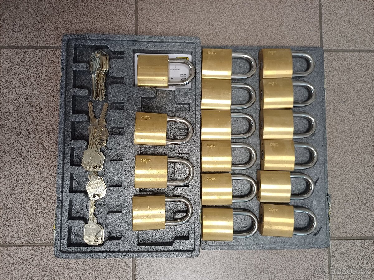 Prodám sadu 16 ks visacích zámků na systém generálního klíče (4 podskupiny na hlavní klíč po 4 kusech). Bezpečnostní karta na doplnění systému je součástí. Výrobce EVVA. Cena 6 000,- Kč