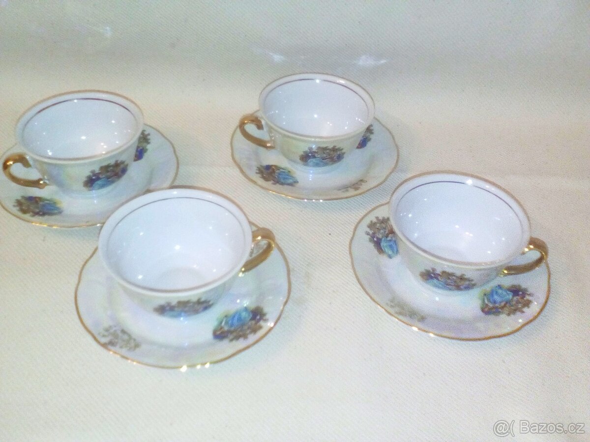 Sada 4 porcelánových kávových šálků s podšálky - [28.10. 2025]Čtyři menší kávové šálky s podšálky z bílého porcelánu se starším květinovým dekorem v růžovo‑fialových odstínech a se zlatou linkou na okrajích. Klasický tenkostěnný tvar, vhodné na espresso či malé cappuccino. Stav odpovídá stáří, místy lehké setře ...