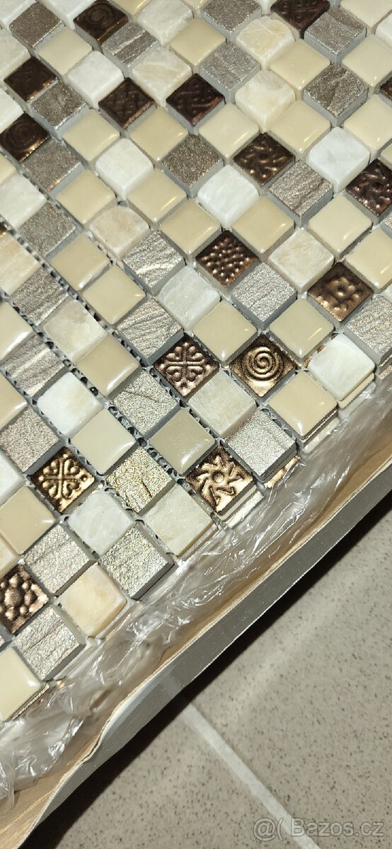 Kvalitní mozaika keramická i kamenná béžová. S bronzových kostkami. 30 x 30 cm 7 plátů. Jeden stál 340, Kč Prodám celé za 690 Kč