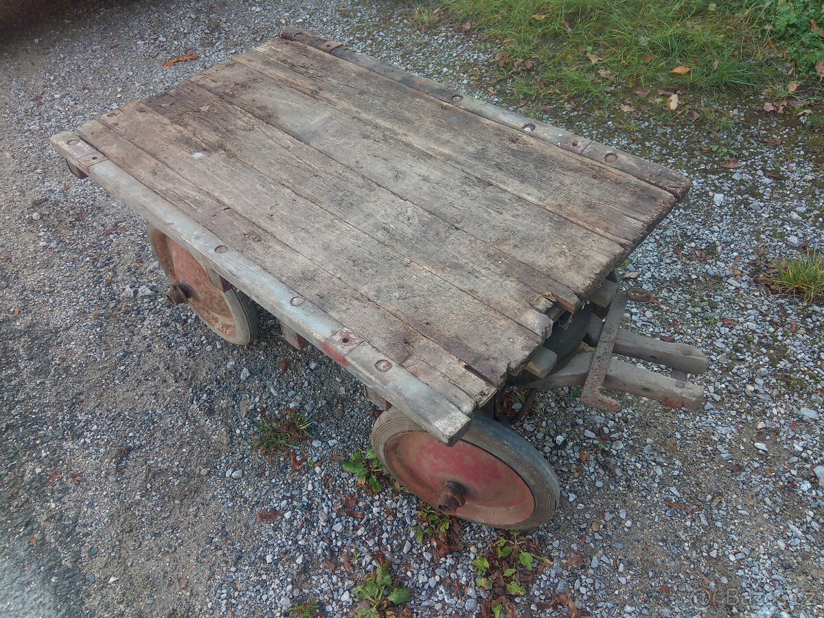 Dřevěný, plechová kola. Rozměry - 102x62, výška 42cm, kola 32cm. Předání Brno, Brno-venkov, prosím-ne SMS