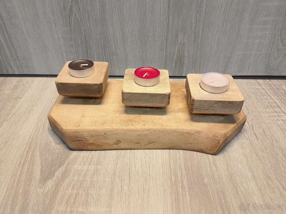 Prodám dekorační svícen ze dřeva o velikosti 30x15 cm z masivu. Materiál Buk ošetřený včelím voskem v dekoru kaštanu