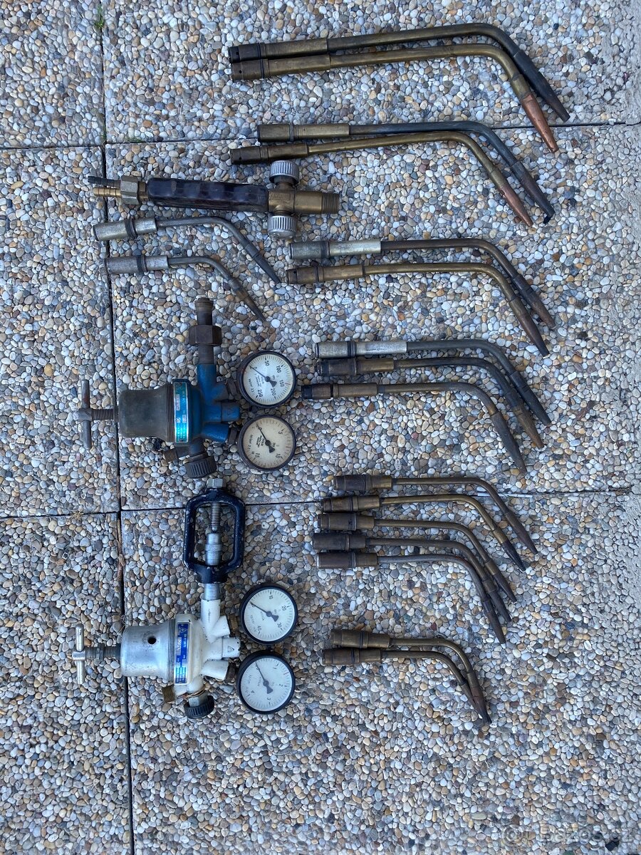 Sada hořáků k autogenu: 1-2 2x, 2-4 5x, 4-6 5x, 9-14 2x, 14-20 2x, 1-2 1x, 0,5-1 1x, budíky, pistole-již prodána.