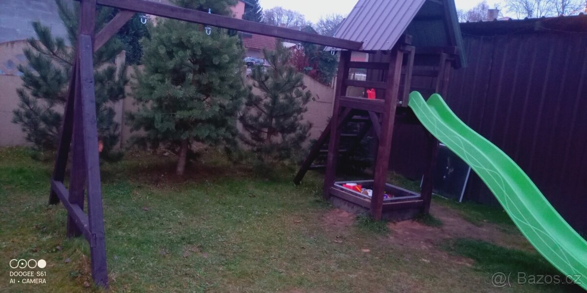 Dětské hřiště se skluzavkou - [22.11. 2025]Nabízím dětské dřevěné hřiště se skluzavkou, houpačkami a horolezeckou stěnou.