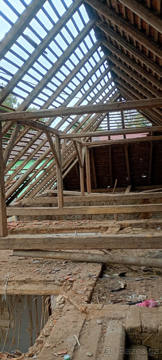 Materiál: trámy, krovy, prkna, střešní tašky, zbytky techniky. Za rozebrání a odvoz dřeva a střešních tašek.