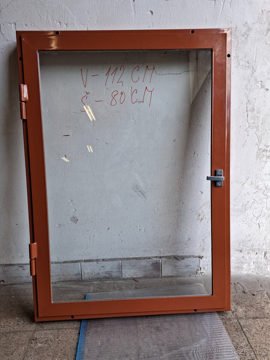 Prodám nové ocelové nové dvířka s rámem, povrch Komax, levé, rozměr 112 x 80 cm, sklo tl. 6 mm, čiré