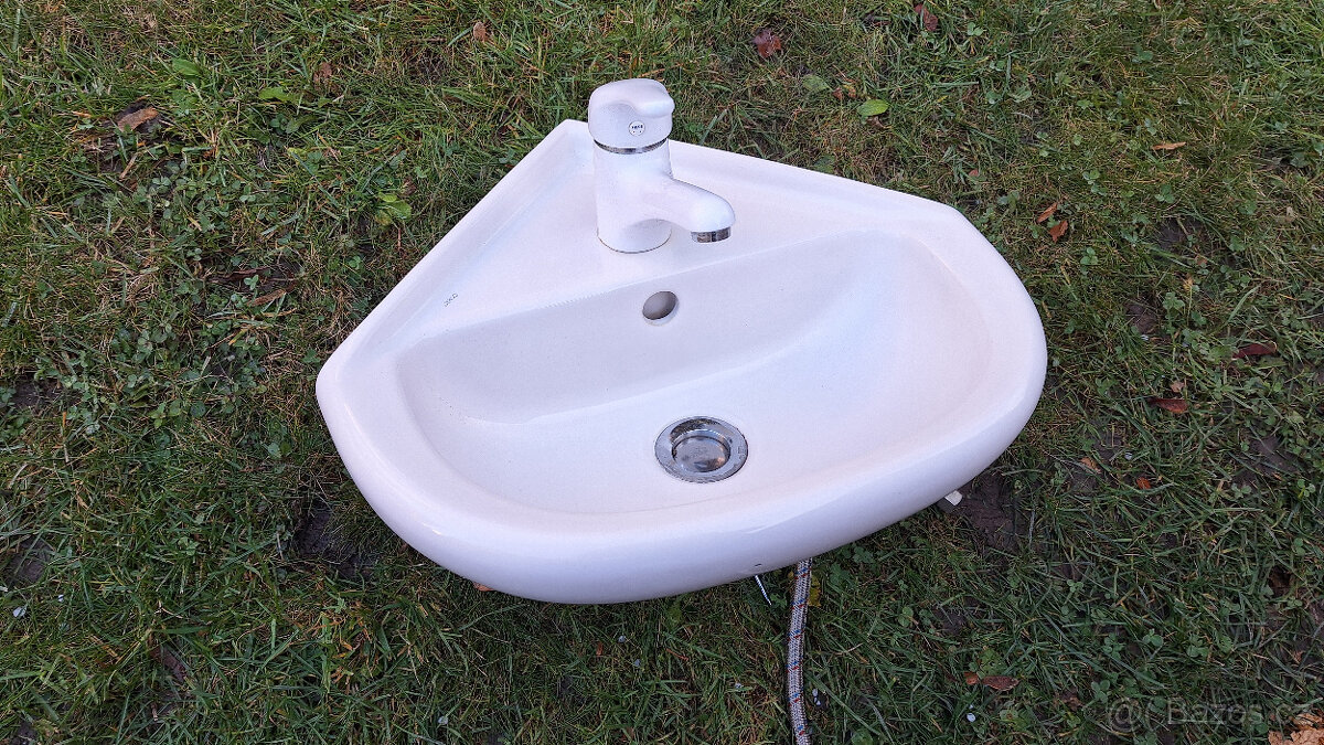 Z důvodu rekonstrukce nabízím k prodeji rohové umavydlo Jika s bílou vodovodní baterií, výpustí atd. viz foto. Vhodné na WC či menších koupelen na chatu apod.