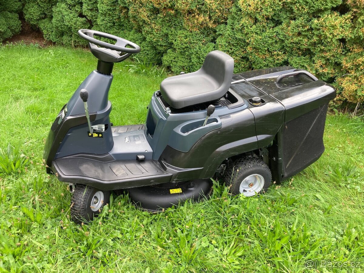 Motor Honda 13Hp, převodovka hydrostatická ovládaná pedály, sečení se záběrem 80cm spouštěné elektromagnetem, posuvné sedadlo.
