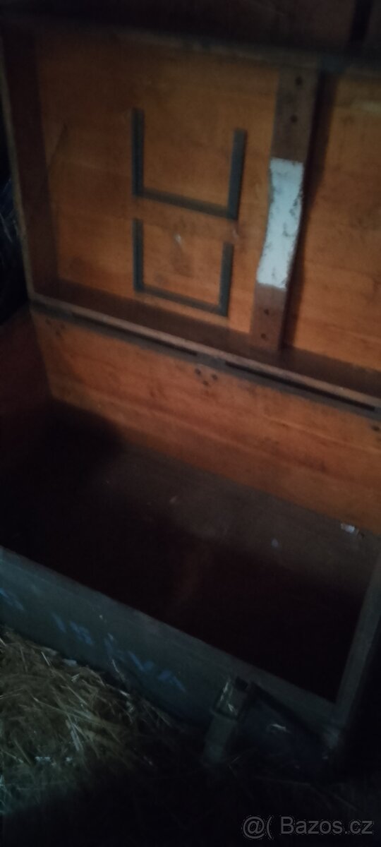 Staré dřevěné vojenské bedny, kovové oplachování, kovové rukojeti a zavírání. 3 ks. Rozměry 185x60x46, 87x53x46, 54x49x57. Cena za ks. tel. 732 968 589.