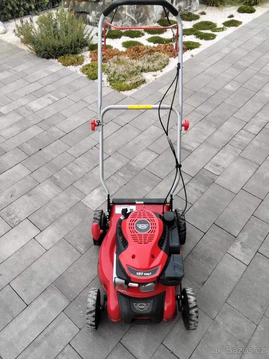 Nabízím tuto funkční sekačku po servisu -vymena oleje, promazání pojezdu, broušení nože, vyčištění karburátor filtr.jen sekat.zachovala,bez koše.Benzínová sekačka s pojezdem, vhodná pro menší a středně velké pozemky do 750 m2. Na kvalitním ocelovém šasi je usazen čtyřtaktní motor obsahu 127 cm3 s jmenovitým výkonem 2 kW. Pod šasi rotuje ocelový nůž se záběrem 40 cm. Nastavení výšky je prováděno centrálně jedinou pákou v rozsahu 25 - 75 mm. Rychlost pojezdu je 3,4 km/h. Polstrované madlo tlumící vibrace lze díky křídlovým maticím velice snadno a rychle složit při přepravě sekačky, nebo při jejím uskladnění.