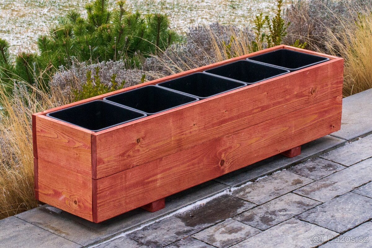 Dřevěný truhlík vhodný na zahrady, terasy a balkony. Díky vyjímatelným květináčům je možné schovat květiny na zimu. Snadná manipulace a možnost různě měnit rozestavení rostlin.