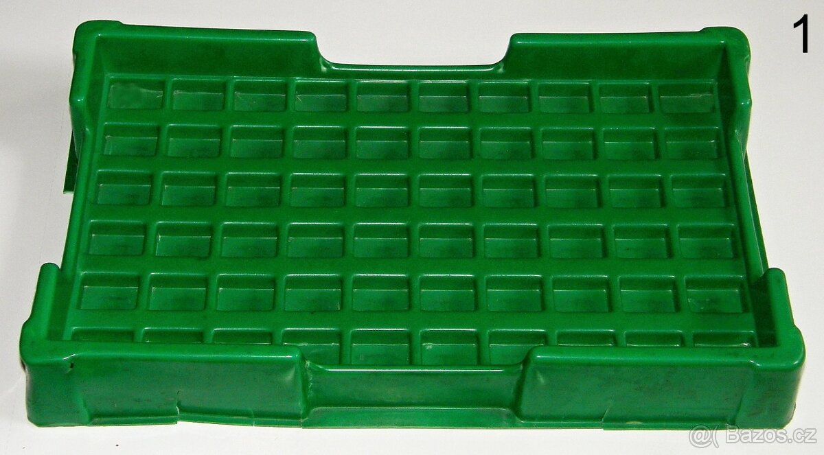 1. 34x21cm,výška 4,5cm, 60 přihrádek 2,5x2cm, barva zelená, oranžová, celkem cca 200 ks, cena 15 Kč/ks.