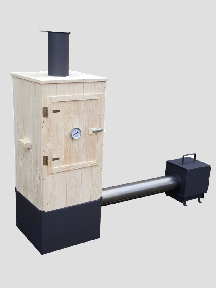 Lehce rozložitelná dřevěná udírna s podstavcem z ocelového plechu, 1m kouřovodem a externím topeništěm (tl. 3mm, rošt 10mm).