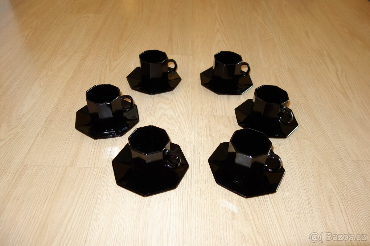 Prodám sadu šálků a podšálků na kávu ve tvaru osmihranu, nejspíše značka Luminarc. Jedná se o černé sklo, vyrobeno ve Francii. Objem hrnku cca 150ml. Sada je nová, podle mě nikdy nepoužitá, ležela ve vitríně.