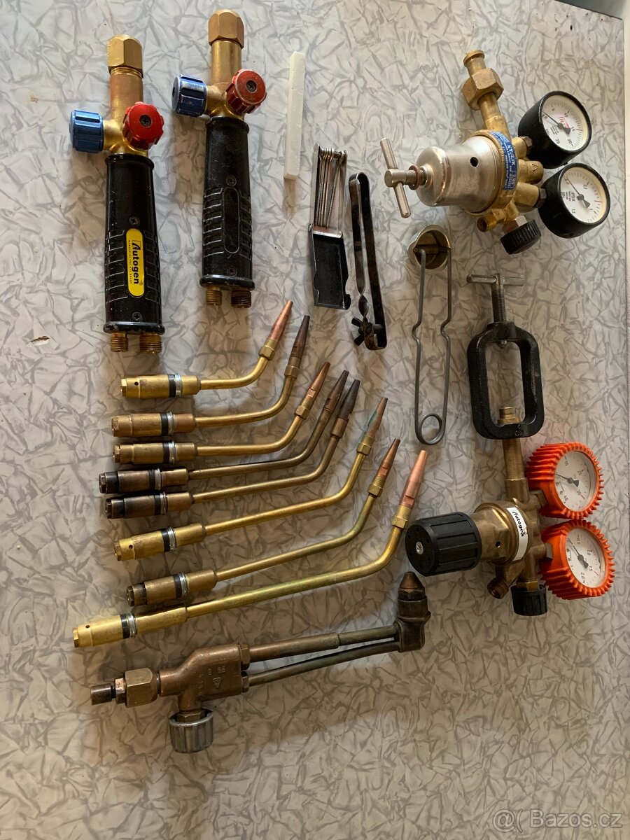 Prodám hořáky a redukční ventily na autogen. Vše velmi zachovalé viz. foto. Cena za vše včetně plastového boxu 3500,-Kč.