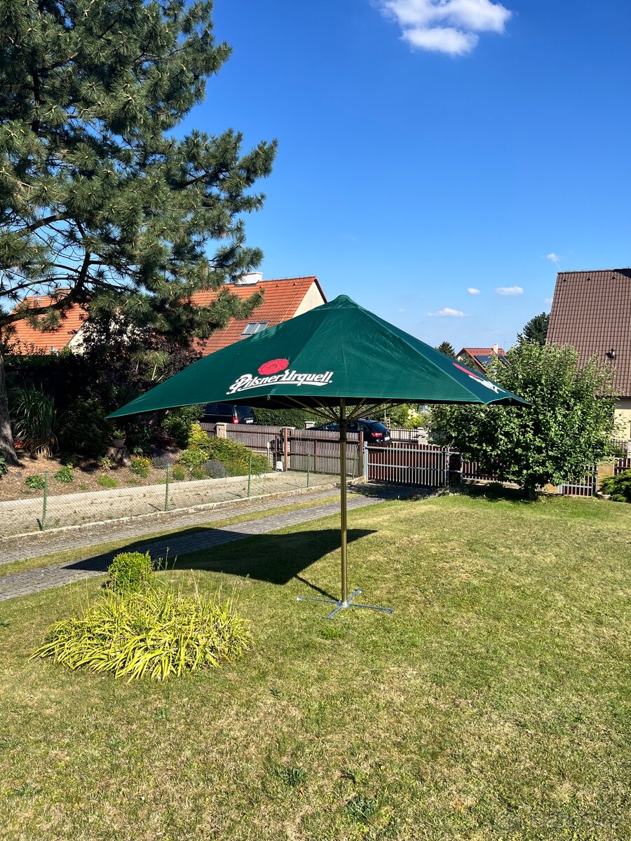 Prodám jednu sezonu použitý hospodský slunečník Pilsner Urquell rozměr potahu je 3,5 m x 3,5 m