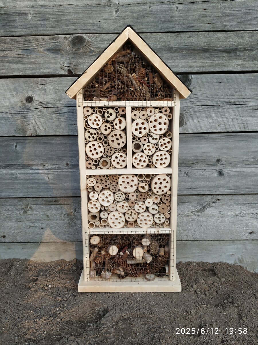 Prodám VELKÝ HMYZÍ HOTEL (včelín, domeček) S DELŠÍ TRVANLIVOSTÍ OPROTI OBCHOD. ŘETĚZCŮM DÍKY POUŽITÍ SILNĚJŠÍHO MASIVNÍHO DŘEVA. Rozměry: výška 52 cm, šířka 30 cm, hloubka 7 cm. Jedná se o hit současné moderní doby, který postupně nahrazuje na zahrádkách a na terasách trpaslíky, může být umístěn i na balkóně. Pořízením hmyzího hotelu přispějete k záchraně mnoha populací hmyzu, jako jsou např. včelky samotářky, slunéčka sedmitečná, zlatoočka, motýly a škvoři.