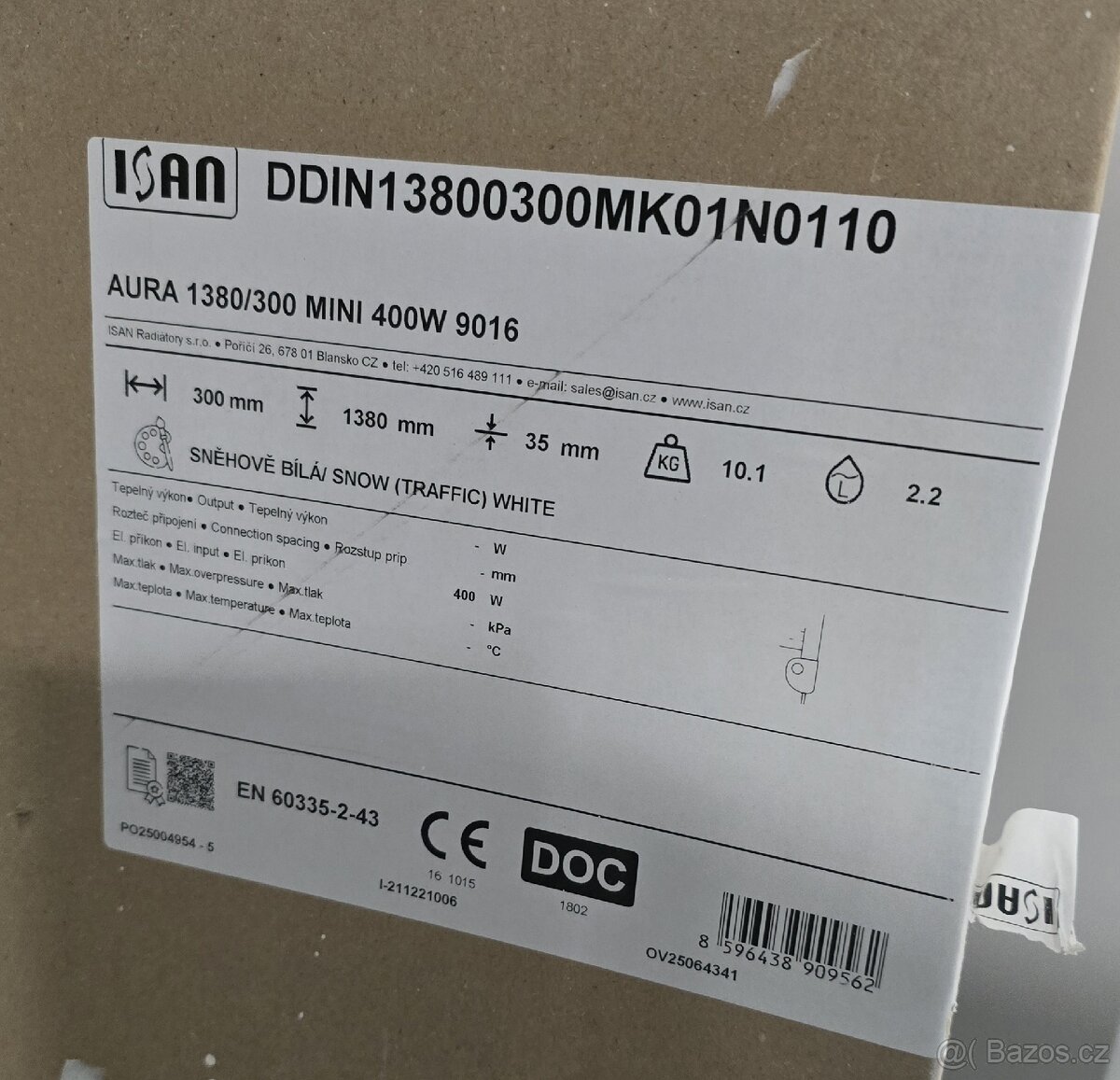 Prodám úplně nový, zabalený trubkový radiátor ISAN AURA 400W 300x1380mm. Liberec, osobní odběr.