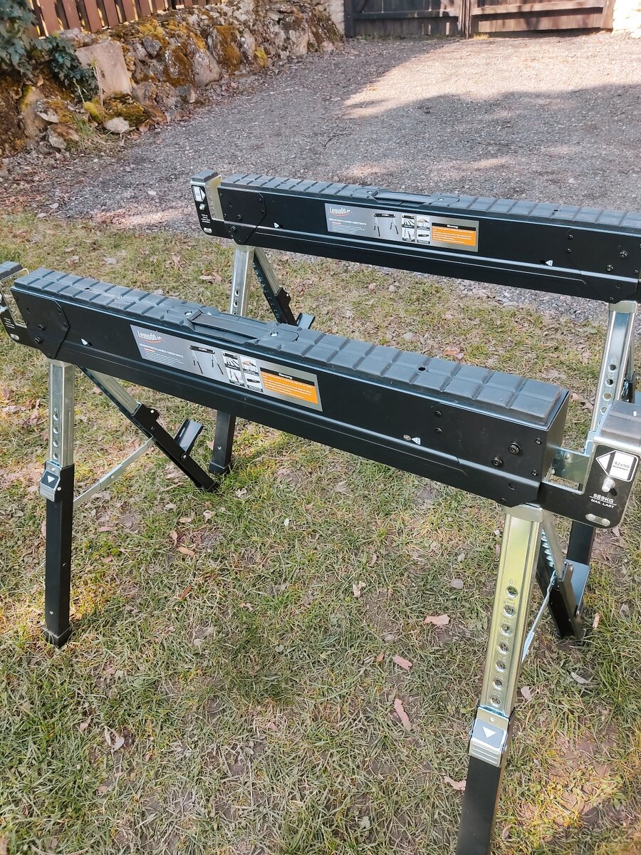 Po rozložení výškové nastavení každé nohy samostatně od 65 do 85 cm, možnost umístění na nerovném povrchu a vytvoření roviny. Dvě nohy se sklopnou zarážkou, o kterou lze opřít desku, např. SDK nebo OSB. Možnost vytvoření pracovní plochy či stolu.