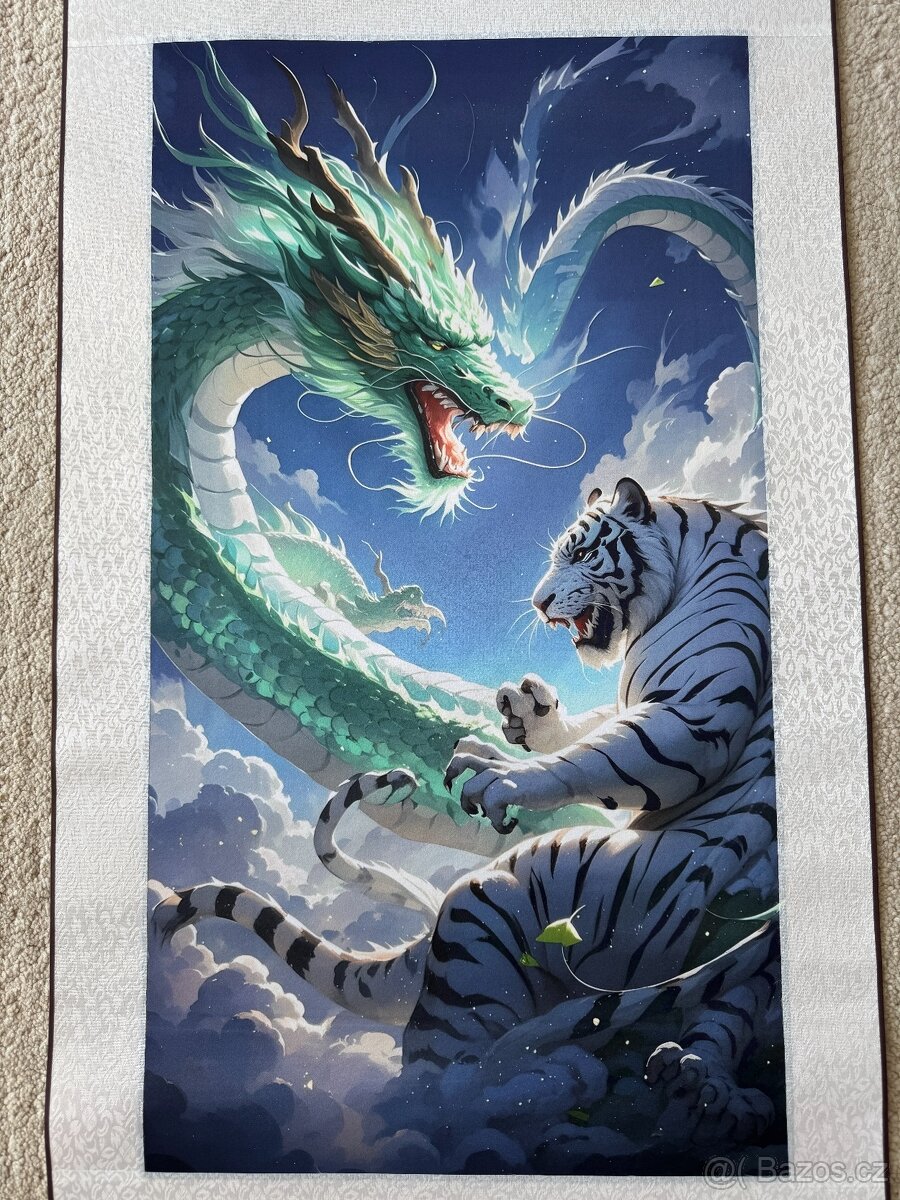 Prodám tradiční čínský svitkový obraz s kaligrafií. Tygr a drak na hedvábí.