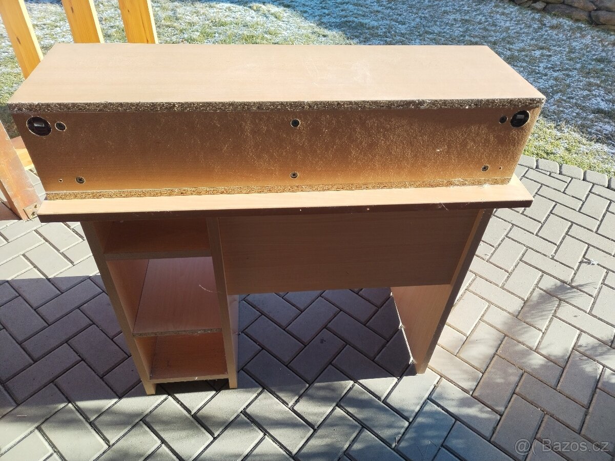 Psací stůl - [21.12. 2025]Prodám velmi pěkný, neponičený psací stůl. Součástí je i zadní stěna na TV, knížky atd. Plně funkční zásuvky, ve spodní části je místo třeba na tiskárnu Dekor buk/modrá, dlouhý 180 cm, výška 190 cm a hloubka 60 cm. Je to kus nábytku. Jen osobní převz ...