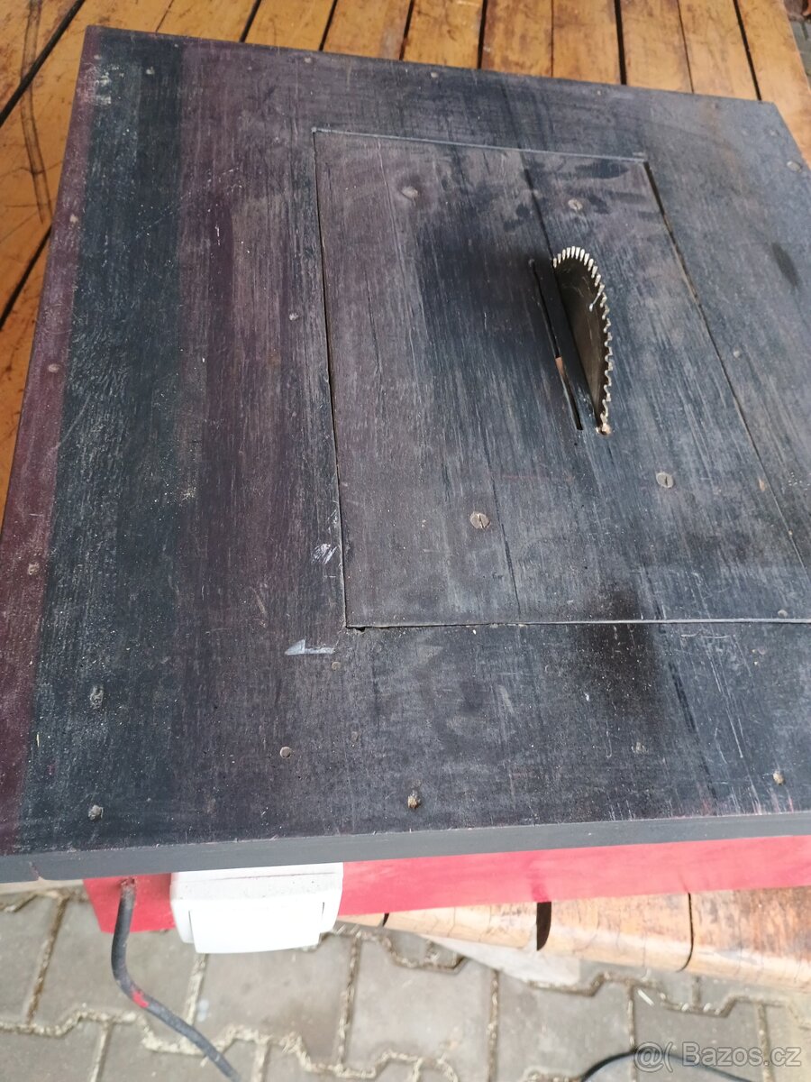 Malá cirkulárka osazana pilou EPK 16, nebo po výměně desky jinou, druhá deska připravena pro EPL75.Rozměr pracovní desky 57x53cm,výška stroje 25cm,odsávání vnitřního prostoru pr.3,5cm pro prům.vysavač.Z levé strany zavírací otvor pro nastavování pily.Uvnitř zásuvka pro připojení, zvenku vypínač.Pouze osobní odběr.