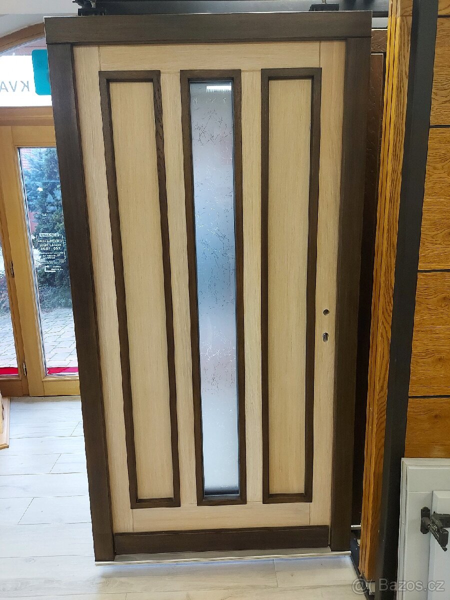 Prodam dubové dveře profil 78 mm barva olej kombinace hnědé a krémové barvy. Rozmer 106 x 205 právě. 3D panty , tříbodový zámek, izolacni trojsklo, termo prah. Dveře jsou nové nepoužité bez poškození