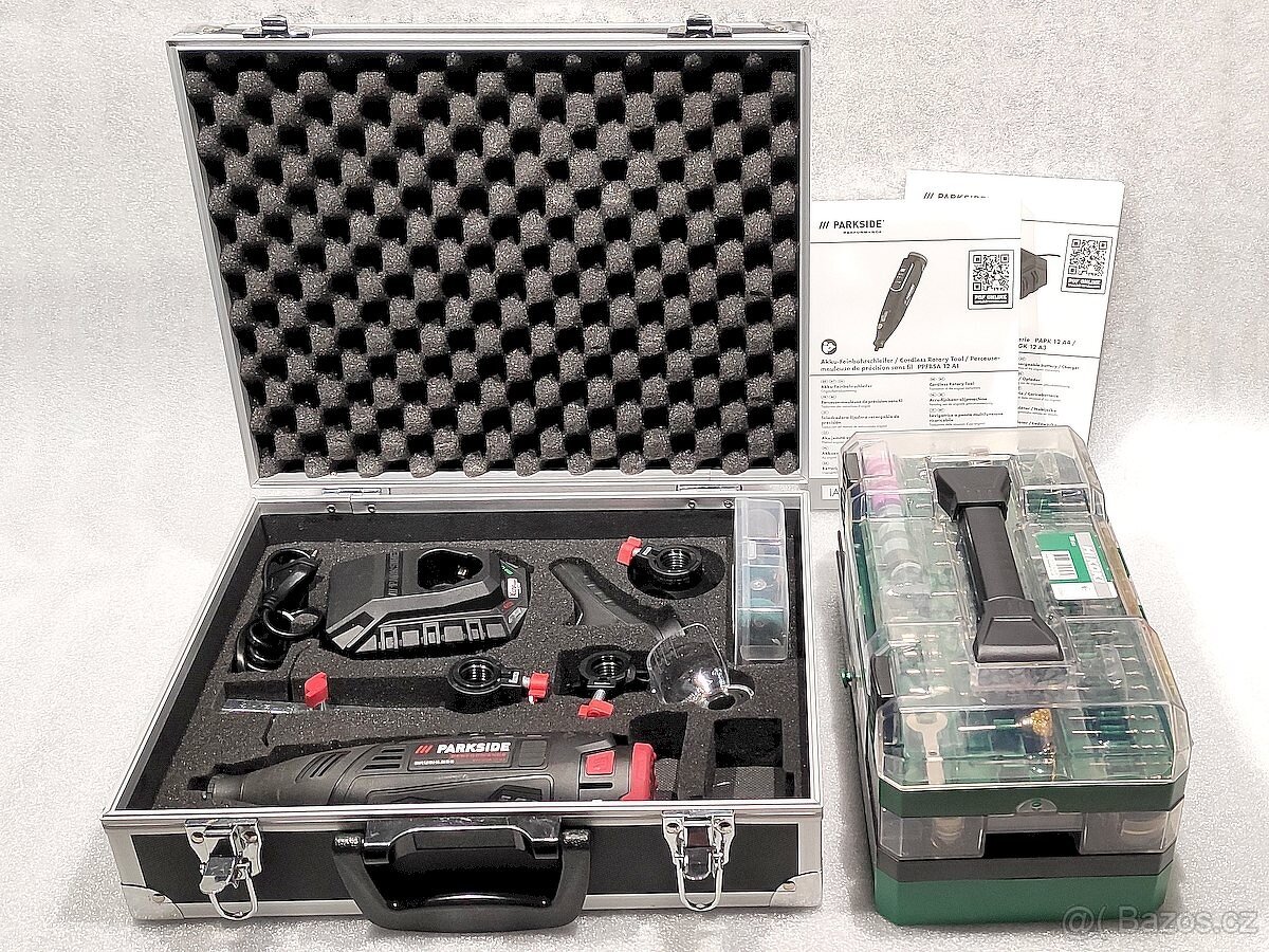 Sada na jemne brouseni: aku vrtaci bruska Parkside Performance PPFBSA 12 A1 set (viz foto) + sada prislusenstvi Hikoki 753949 389 ks. V zaruce jeste cca 4 roky. Bruska pouze vyzkousena, vsechno prislusenstvi nepouzite. Prodavam z duvodu nevyuziti.