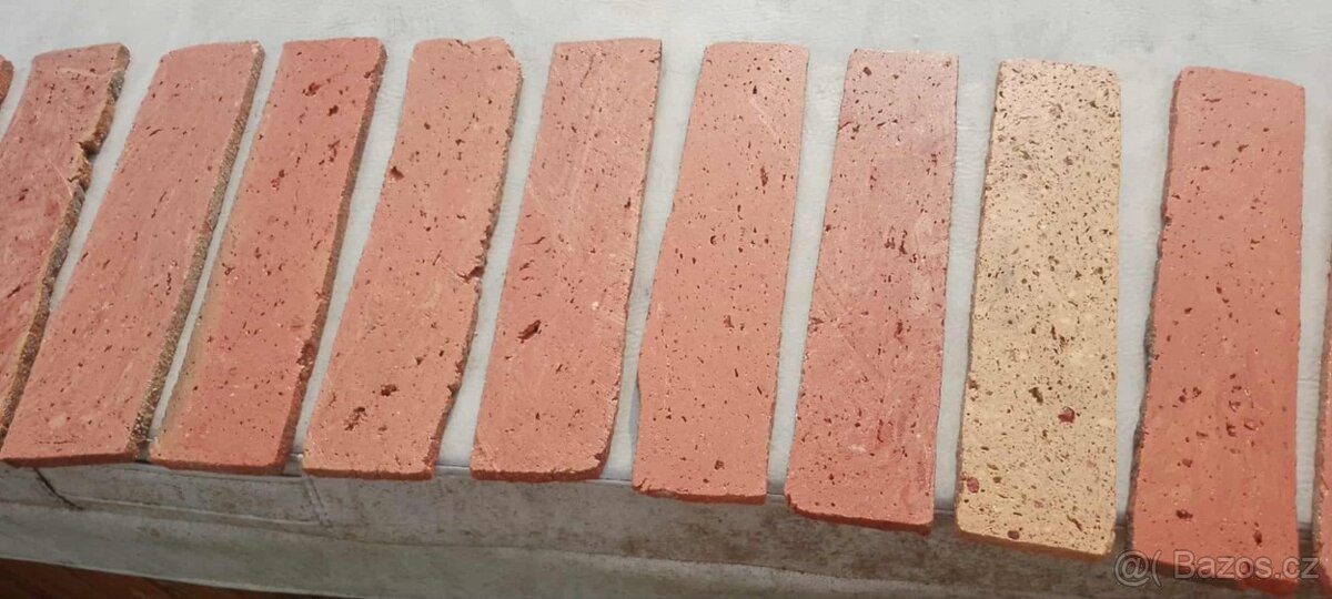 Cihlové obklady pásky z cihly - [9.12. 2025]Prodám cihlový obklad. Rozměry 14,5 * 6,5 * 2 cm . Vhodné do interiéru i exteriéru. Cena 400 Kč za M2 = 80 kusů. Prodej po metrech čtverečních libovolné množství. Momentálně k dispozici 250 M2. Při nákupu nad 8000 Kč doprava zdarma po celé ČR.