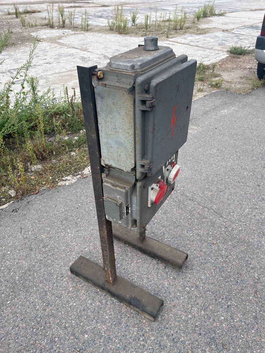 Prodám stavební rozvaděč na robustní ocelové konstrukci, osazený zásuvkami 400 V (32 A) a 230 V, jističe + proudový chránič.