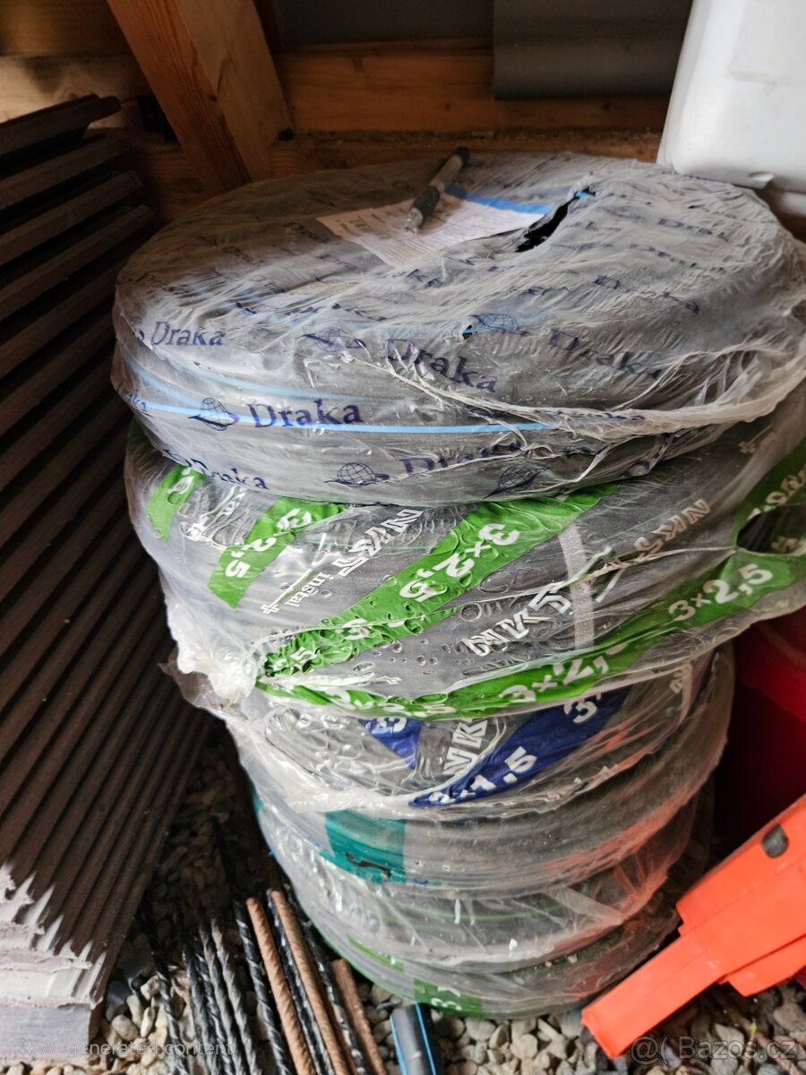 Prodám 200m 3x1,5mm za 14kč/m a 400m 3x2,5 za 24kč/m, balení po 100m a chráničky (husí krky) 200m průměr 20mm za 4kč/m, balení po 50m.