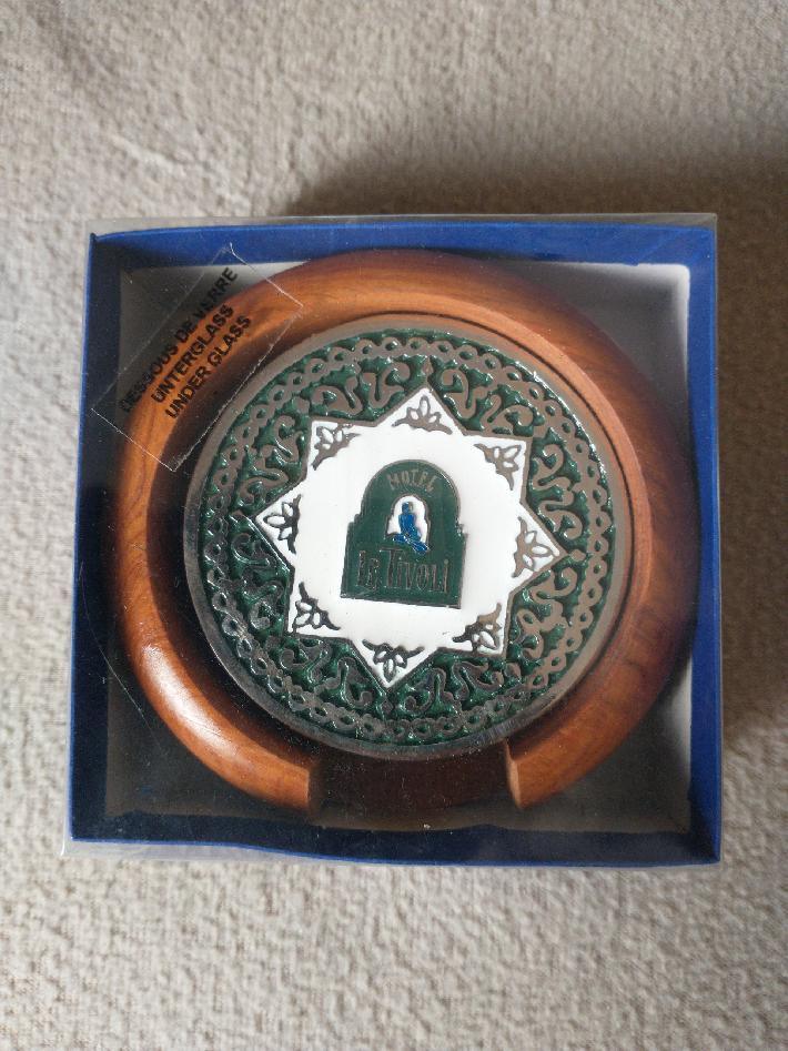 Kovové podtácky s logem marockého hotelu Le Tivoli zdobené smaltem. Stojánek z exotického dřeva.