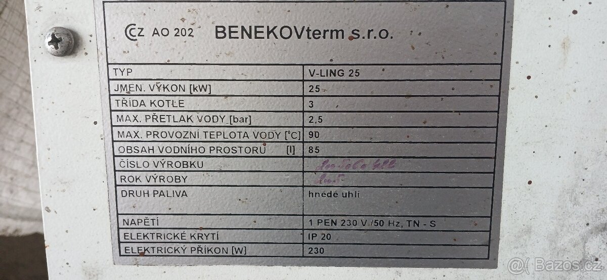 Kotel Benekov Ling 25 - [19.12. 2025]V provozu od 11/2006 do letošního jara, včetně příslušenství, viz foto, naložím vozíkem.
