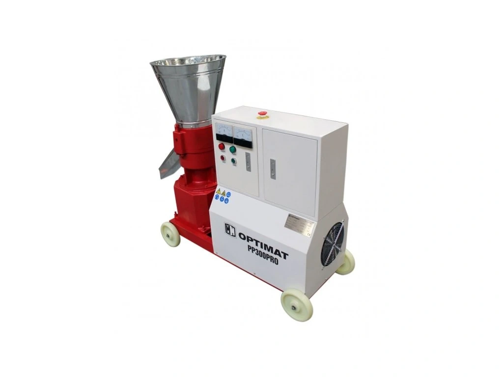 Mlýn na pelety polské značky Optimat, model PP300PRO, slouží k výrobě velkého množství granulátu v krátkém čase, skvěle funguje na výrobu pelet z organických materiálů, které lze použít k vytápění a hnojení i jako krmivo pro zvířata.