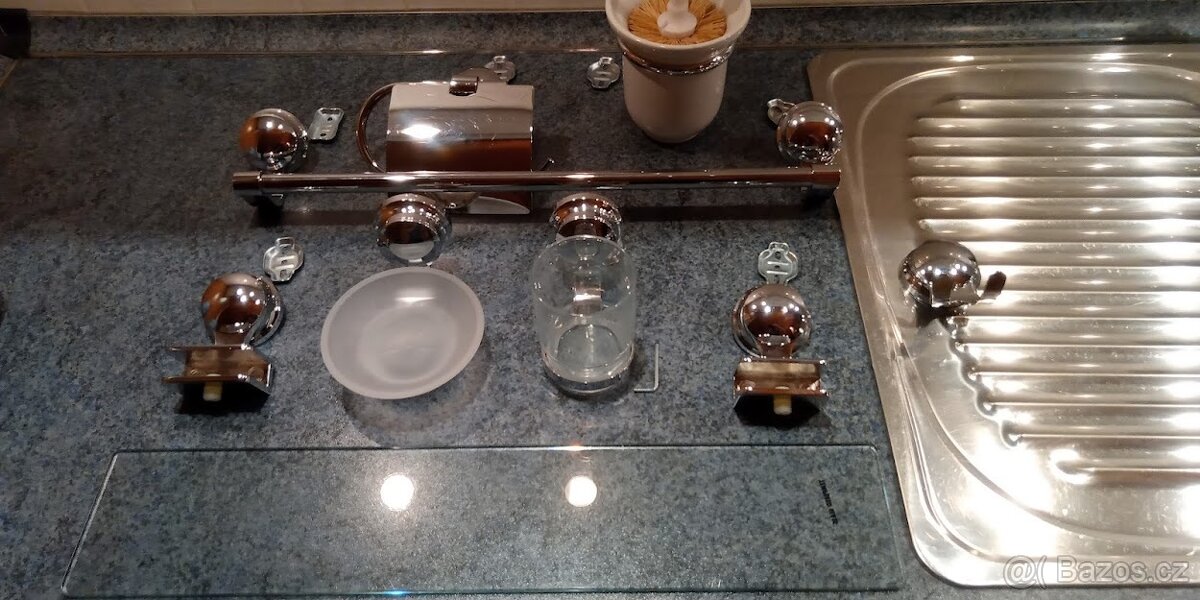 Predám 7 dielnu pevnú a kvalitnú súpravu kúpeľňových doplnkov v chróme ako na foto, v zachovalom funkčnom stave, minimálne známky používania, vrátane upevňovacieho mechanizmu a skrutiek, materiál kov a zliatina.