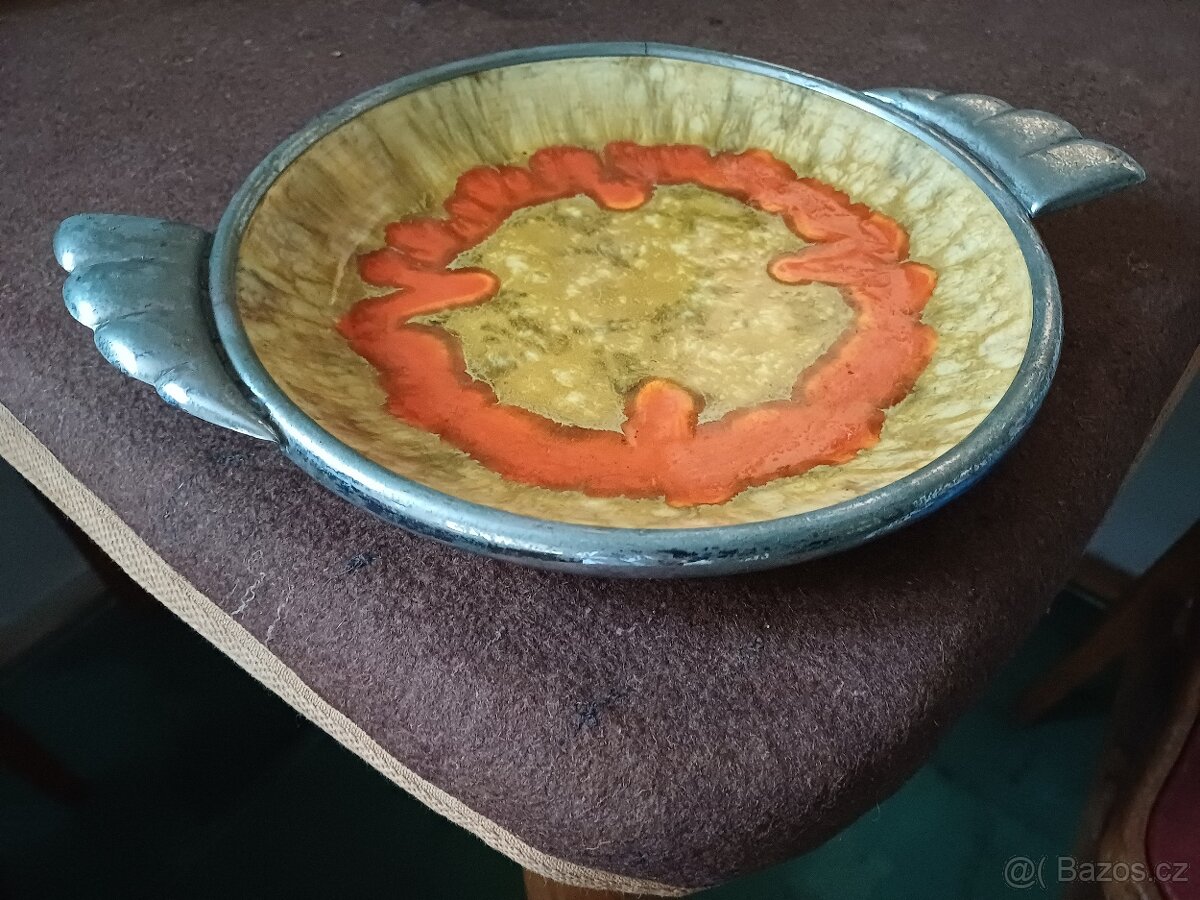 Nabízím omáčník (na spodku dva odštěpky), starožitný cedník a barevný podnos s kovovými úchyty.