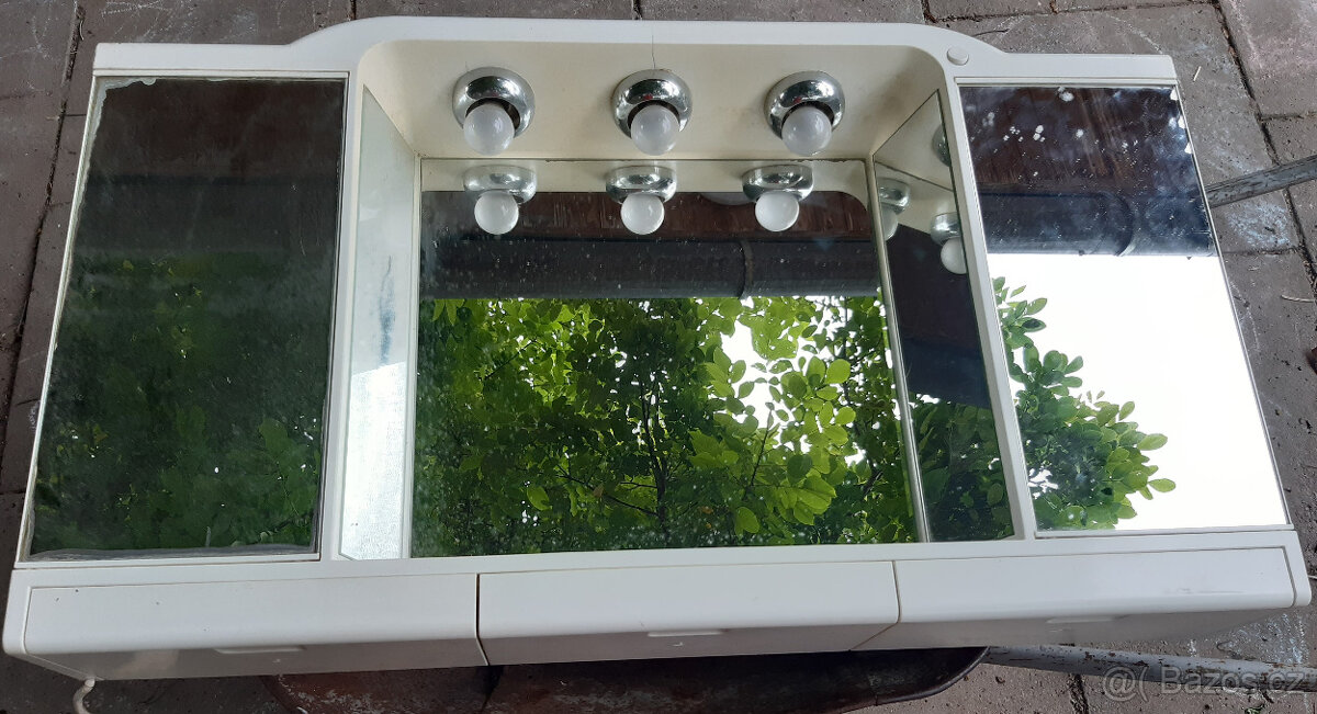 Trochu retro, dole 3 šuplíky (nejsou moc patrné z fotografie), osvětlení, elektrická zásuvka, rozměry na vyžádání. Kontakt prosím emailem. Děkuji.