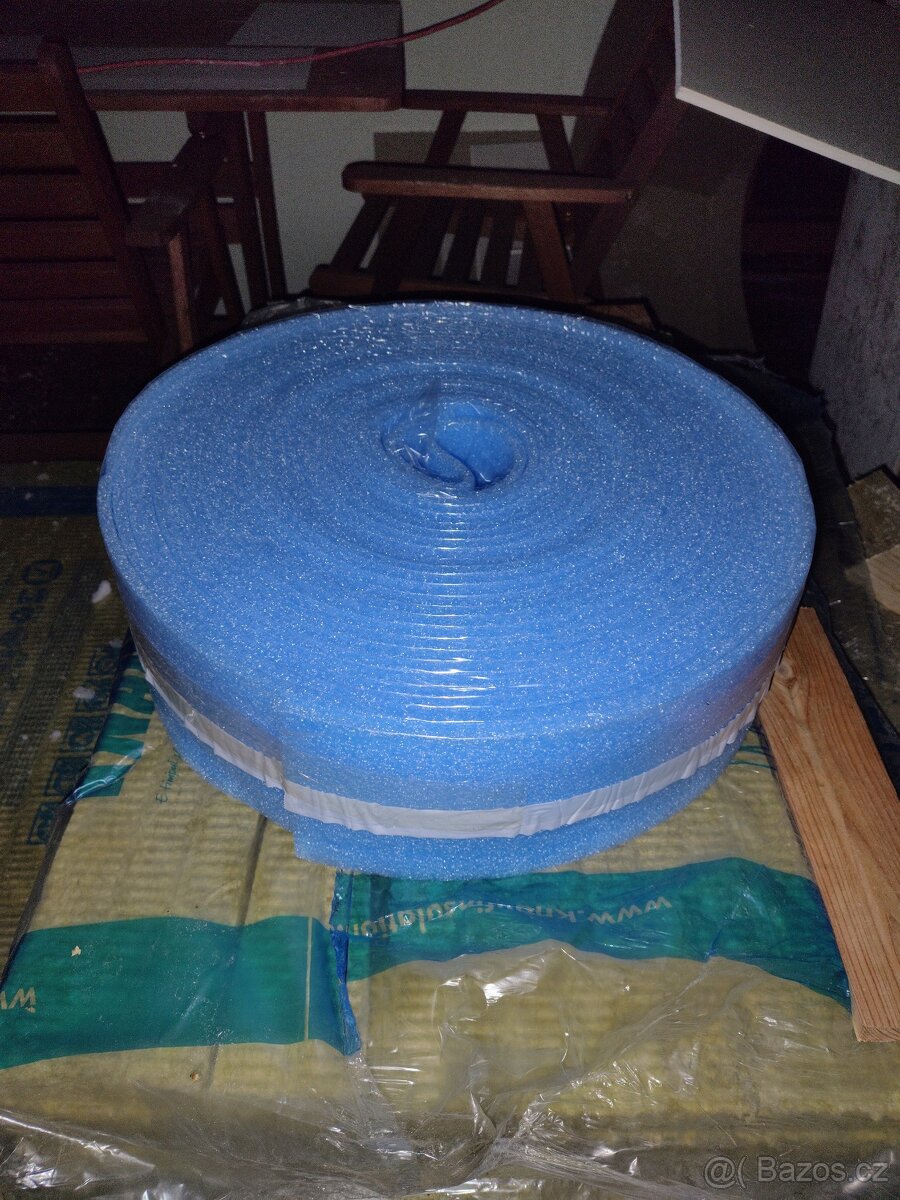 Prodám dilatační okrajovou pásku, délka 25 metrů, šířka 150 mm, tloušťka 8 mm, samolepicí páska, s folií.