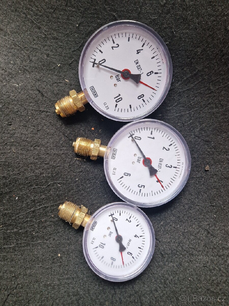 Wika manometr větší množství různé druhy EN 837-1.Jednou použité k natlakovaní okruhu /zkouška/. Viz.foto. Dohoda možná. Cena za kus.