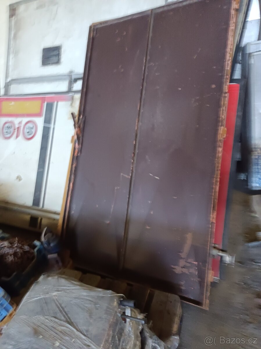 Prodám plechové garážové dvoukřídlé dveře. Rozměry výška 190cm, šířka 220cm. Dveře jsou bez rámu. Cenu nabídněte