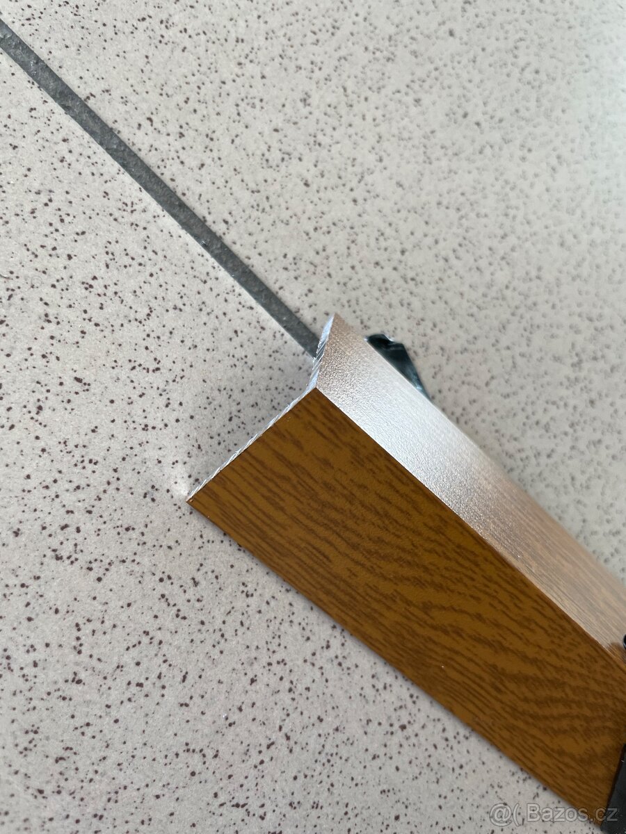 ALU úhleník lakovaný barva: zlatý dub, je možné říznout na přesný rozměr. Tyče jsou 6,5m dlouhé. Celkem skladem 290m. Cena 90kč metr, při větším odběru možná sleva!