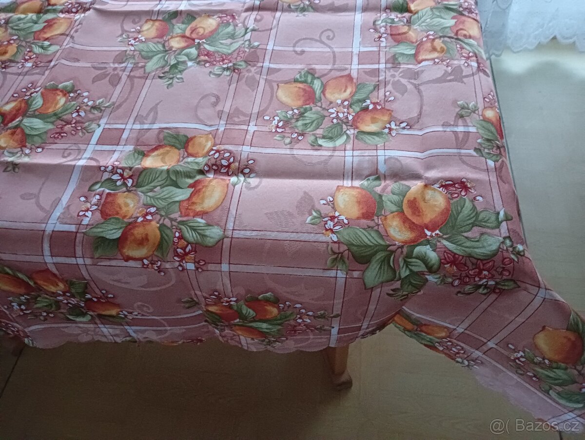 Nabízím nové teflonové ubrusy s nešpinivou úpravou,100% PES,oba ubrusy mají obloučkové zakončení. Jeden ubrus je krásně zlatavý,druhý barevný s ovocem,asi citrony. Rozměry 120x140cm