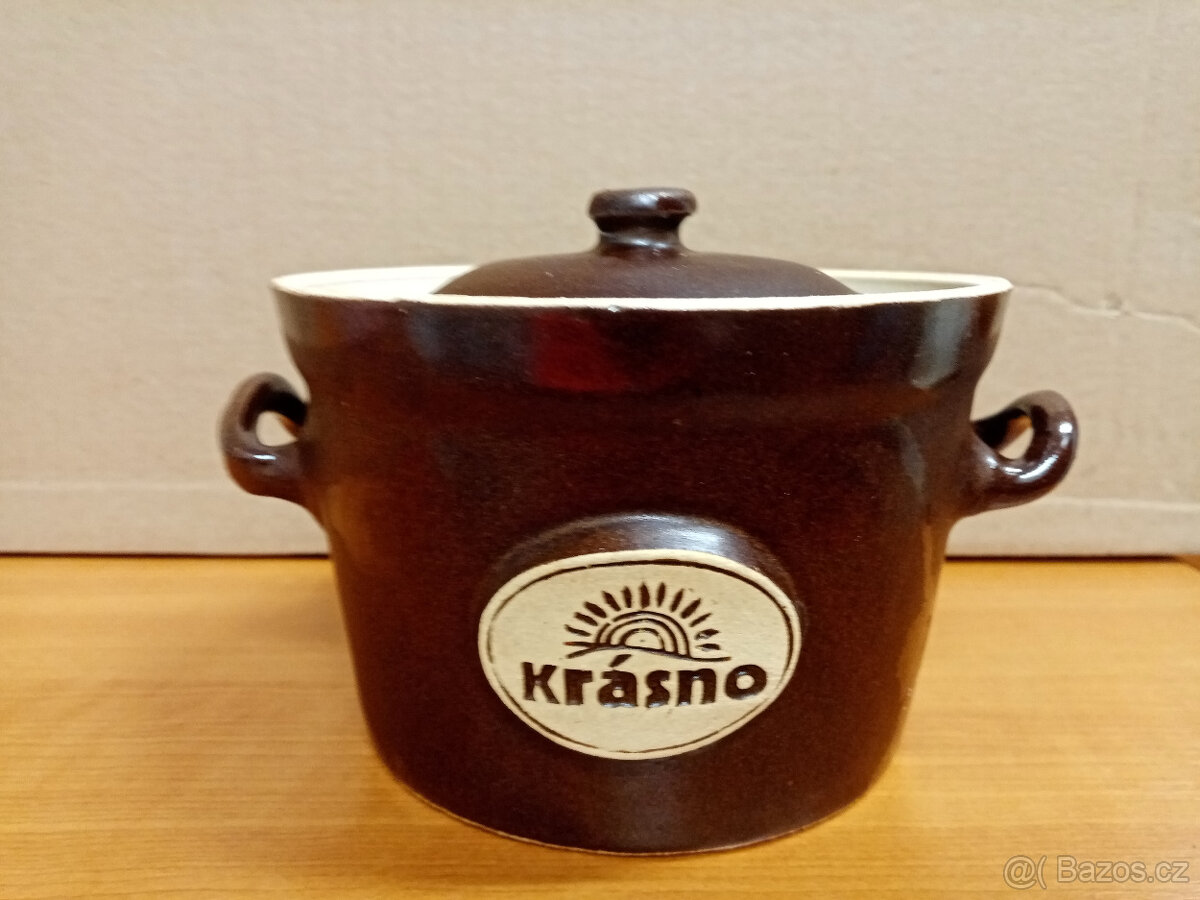 Krásný, dekorativní hrnek s oušky plný výborného škvařeného vepřového sádla.