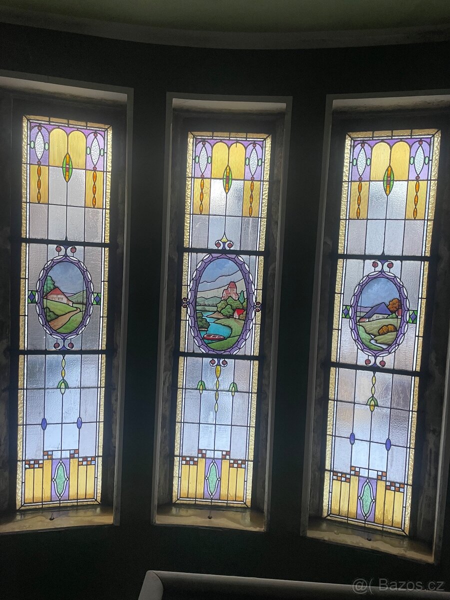 3 ks podélných vitražovych oken, 3 male prasklinky- každá jinde. Cca 2,5m* 0,5m. Je potřeba vyjmout a odvézt.