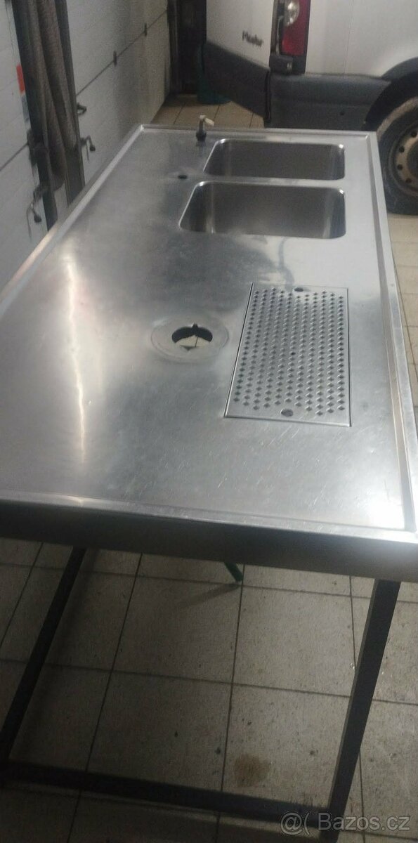 Prodám nerezový výčepní stůl se zabudovaným odkapávačem, s otvorem na pípu, dva dřezy