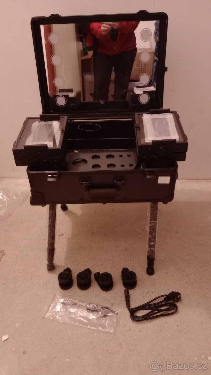 Jedná se o profesionální kosmetický kufr se zrcadlem a osvětlením, který lze rozložit na přenosný toaletní stolek.
