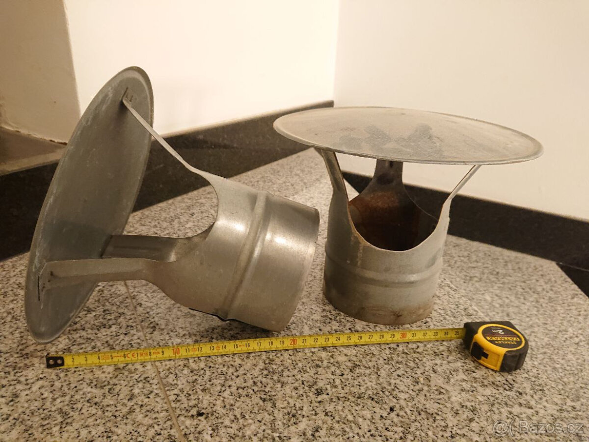 Prodám komínkové stříšky 2 ks, průměr stříšky 24 cm, průměr komínku 11,6 cm. Cenu prosím nabíďněte.