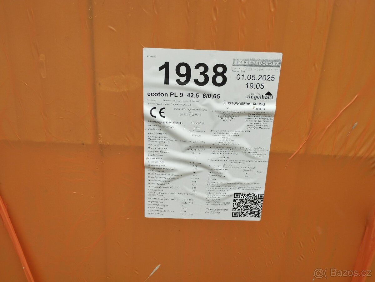 Prodám cihly ecoton 42,5 cm.Zbylo 5 palet po 36ks ještě zabalené od dodavatele.Cena za cihlu 75kč.Celkem 13500